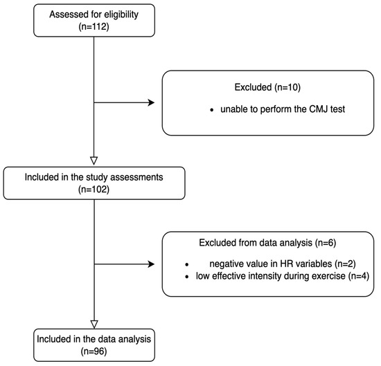 Two participants’ results had negative values for HRR and HRPV on the spreadsheet, which led to their exclusion from the data analysis. In addition, four participants were excluded from the data analysis because they did not achieve a vigorous effective HR value according to our inclusion criterion (HR at the end of exercise > 60%) during exercise. Ninety-six participants (age 22.5 ± 4.8 years; height 169.7 ± 10.5 cm; body mass index 23.2 ± 3.7) were included in the data analysis: 40 females and 56 males. All participants were white ethnic Europeans (Figure 4).