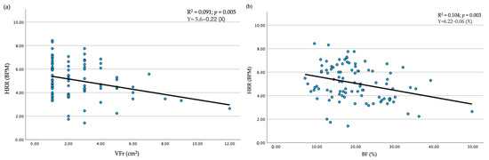 In all models, the coefficient of determination, R2, showed low values (R2 ≤ 0.1). However, while no significance was found for BW as an explanatory factor (p > 0.05; R2 < 0.1), VFr and BF are important explanatory factors among the body composition variables (VFr p = 0.005, R2 = 0.091; BF p = 0.003, R2 = 0.104) for HRR (Figure 5a,b), but the coefficient of determination, R2, also showed a low value. Both confounding factors, NJ and wPA, did not result as predictors of HRR (p > 0.05) (Table 4: a).