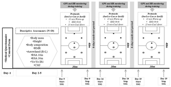 A randomized, three-trial crossover design was implemented (Figure 1). In order to limit detraining and ensure that players were still used to rigorous conditioning and game load, the study was performed one week following the in-season. Volunteers participated in three protocols: (a) I-intermittent SSG protocol (Int-I); (b) Continuous SSG protocol (Con); and (c) II-SSG protocol (Int-II). Participant body mass, height, body composition, and performance were measured prior to the first protocol execution, and all procedures were explained to them. All the SSG protocols were performed on a natural grass field under the same conditions (20–22 °C). In between trials, a 4-day washout period, during which soccer players participated in daily light training, was applied between protocols. This 4 day period was preferred, since it has been observed that 48 h after SSG execution, 72 h is a sufficient time for the recovery of semi-professional soccer payers [29]. Heart rate monitoring and global positioning system (GPS) devices were used to measure field locomotor activity during protocols. Soccer players were told to keep to their usual diets during the trials.