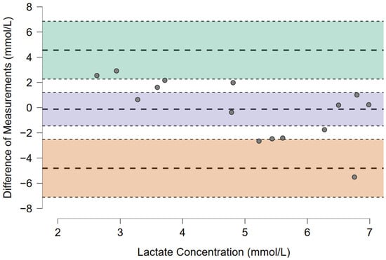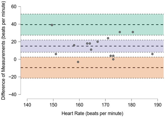 Out of the 15 MLSS assessments, 11 (73.3%) were performed without a bLa increase over 1 mmol·L−1. Statistically significant differences at equivalent SmO2 in normoxia and hypoxia were found for the HR (175 ± 11.7 vs. 160 ± 14.2 bpm, p = 0.005, d = 1.02), but not for the bLa (4.9 ± 1.2 vs. 5.1 ± 2.4 mmol·L−1, p = 0.845, d = −0.05). ICC(2,k) for the HR and bLa were 0.56 (95% CI: −0.24, 0.85) and 0.40 (95% CI: −0.75, 0.80), respectively. The Bland–Altman plots to visualize the agreement between the measurements are presented as Figure 1 and Figure 2.