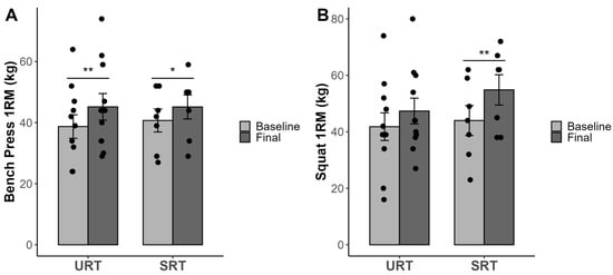 The repeated measures 2 × 2 (group × time) ANOVA showed that there were no significant interactions (group × time) in 1RM for the bench press (F (1,16) = 1.039, p = 0.323, partial eta squared = 0.06) and for the squat (F = 0.744, p = 0.401, partial eta squared = 0.06). However, there were significant effects in time (F = 29,976, p =0.0001, and partial eta squared = 0.65, and F = 15.075, p = 0.001, and partial eta squared = 0.49 for the bench press and squat, respectively). Both experimental groups (URT and SRT) achieved significant increases in the 1RM bench press, p < 0.001 and p = 0.032, respectively. For the 1RM squat, only the SRT group achieved statistically significant pre- and post-treatment changes, p < 0.001, while for the URT group the changes were non-significant, p = 0.076.
