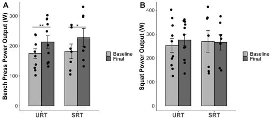 Maximal power output during bench press (A) and squat (B). *,** Significant difference between pre- and post-measurement p < 0.05. and p < 0.01, respectively. Abbreviations: URT = unstable resistance training group; SRT = stable resistance training group.