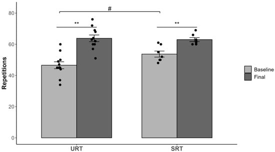 Significant interaction effects (groups × time) were observed for the AB60 performance test (F (1,16) = 7.024, p = 0.017, partial eta squared = 0.31) and for the time (F = 77.665; p < 0.001; partial eta squared = 0.83). Pre- and post-treatment changes for both groups are presented in Figure 3. Both experimental groups (URT and SRT) achieved significant increases in AB60 performance (p < 0.01).
