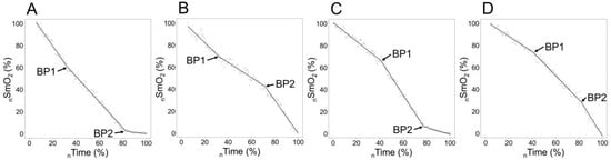As a result of the identification of two breakpoints, we came across four distinct signal combinations, as illustrated in Figure 1; two BPs were found from 65 cases out of 66 (both legs for 33 participants) and from one body side for one participant, and only BP2 was determined. The most typical one, which is established in most of the studies conducted on this topic in cycling [13,21], was type C, where the signal would start with a gentle downward slope; after the first BP, it gets considerably steeper and thereafter, when accounting for the second BP, the signal levels off again.
