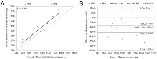 Regression and Bland Altman plots were used to illustrate the relationships (A) and correspondence (B) between the timing of SmO2 signal breakpoints (BPs) for typical (types C and D for BP1; A and C for BP2) and atypical (types A and B for BP1; B and D for BP2) slope changes. These plots were particularly focused on instances where opposing directions of slope changes were observed in the contralateral VL muscles, with the difference being calculated as typical minus atypical.