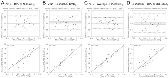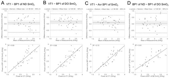 Bland Altman and regression plots between relative power (W/kg) values of VT1 and originally measured SmO2 BP1 of ND side (section A) and DO side (B); average value of ND and DO side (C) and relationship between power values of ND- and DO-side SmO2 BP1 (D).