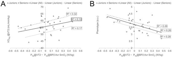 The correlation results (Table 7) indicate that individuals with higher relative VO2kg levels at VT2 tend to reach their AnT at lower power values (more early) at the local (i.e., NIRS) level than globally measured VT2 (illustrated graphically in Figure 5, panel A). On the other hand, phenotypically, more sprinter-like athletes (higher P5s/P@VT2 ratio) encountered either a VT2 earlier before reaching BP2 locally in a muscle SmO2 or the BP2 was to a lesser extent earlier than VT2. Similar trends existed in both Age Groups separately and in the whole sample if the Age Group effect was eliminated (Figure 5, panel B). The significant (p < 0.05) effect of the phenotype to bias between VT1 and BP1 was also confirmed in the whole sample, especially in the Seniors group, but not in the Juniors group separately. No other linear relationships were found between VT1 and BP1 bias and performance characteristics.