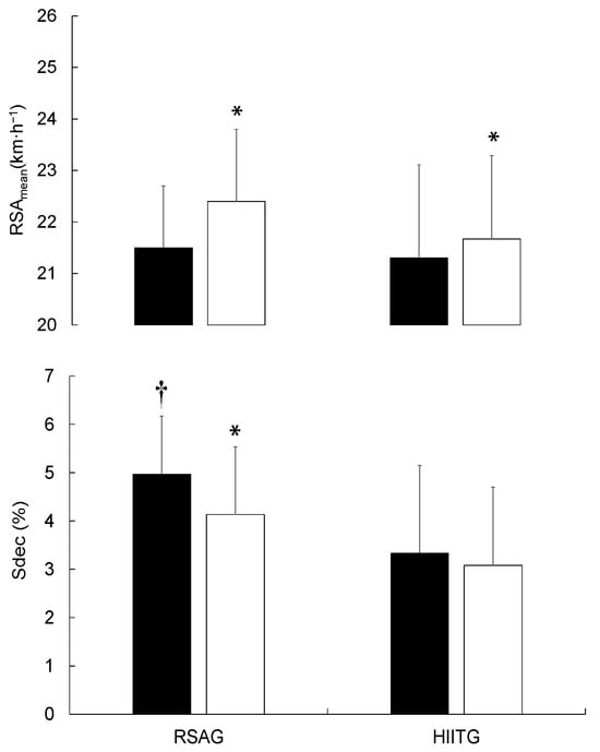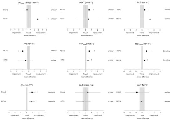 | VO2max (ml·kg−1·min−1) | RSAG | 55.2 ± 7.2 | 54.5 ± 6.5 | −1.1 ± 2.1 | 0.10 (trivial) |