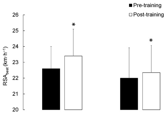 Both training programs significantly (p <0.05) improved the RSAbest values (d = 0.45 and 0.16 in RSAG and HIITG, respectively) as well as the RSAmean values (d = 0.69 and 0.23 in RSAG and HIITG, respectively) (Figure 2). Figure 1 presents an analysis of the beneficial changes observed in both groups. Specifically, the observed percentage changes for RSAbest, RSAmean, and Sdec in RSAG and HIITG were 3.4 ± 2.8%, 4.2 ± 2.6%, −0.8 ± 0.8% and 1.8 ± 1.0%, 1.9 ± 1.1%, −0.3 ± 1.2%, respectively.