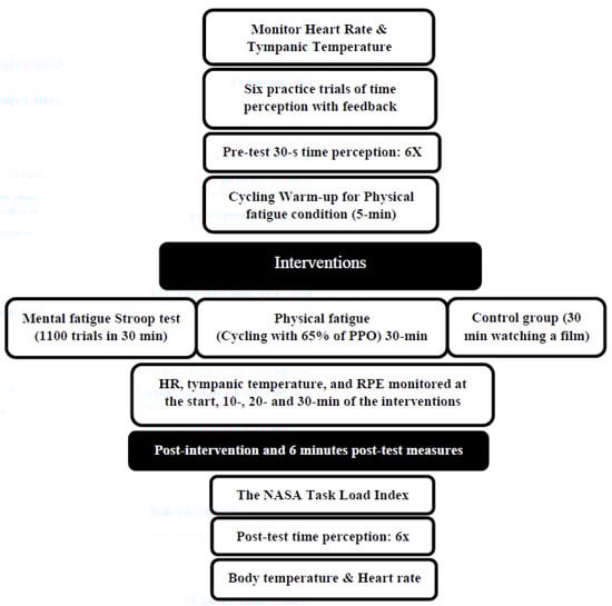 The effects of 30 min of physical and mental fatigue on time perception were investigated using a randomized crossover study design. The participants became familiar with a basic orientation to the testing procedures and equipment during the initial familiarization session, and they performed an incremental cycling test using a Velotron ergometer (Velotron RacerMate, Seattle, WA, USA) to determine their peak power output (PPO). The participants then came to the lab for three distinct testing sessions: physical fatigue (30 min of cycling at 65% of peak power output), mental fatigue (1100 trials of a Stroop test with a duration of 30 min), or control (30 min watching a film). The time perception testing involving estimating the time lapse of 5, 10, 20, and 30 s (6 trials for each test) occurred at pre-test, immediate post-intervention, and 6 min post-intervention. In addition, heart rate, tympanic temperature, and ratings of perceived exertion were obtained at 10, 20, and 30 min into the intervention. Each session was randomized and separated by at least 48 h (Figure 1).