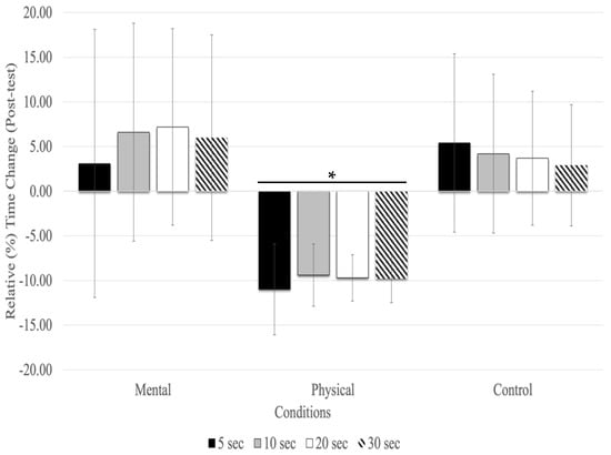 With the post-test, relative time changes showed a significant main effect of conditions (F(1.27,20.43) = 16.83, p = 0.001, ηp2 = 0.513) and testing time (F(1.36,21.89) = 4.12, p = 0.044, ηp2 = 0.205), but there was no significant interaction between testing time and conditions (F(2.60,41.63) = 0.628, p = 0.579, ηp2 = 0.038). The main effect for fatigue conditions showed that physical fatigue resulted in a significant relative underestimation of time compared to mental fatigue (MD = −0.158 s, p < 0.001) and control (MD = −0.129 s, p < 0.001) conditions. There was no significant relative time change between time estimates (5, 10, 20, and 30s) at the post-test with all conditions combined (Figure 2).