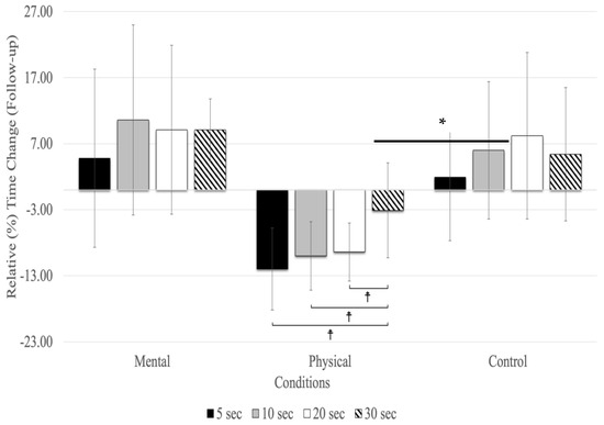 Relative (%) time change for the time estimates at the follow-up (mean % ± SD). Only the physical fatigue condition resulted in a significant (asterisk and horizontal line represent a main effect for the condition: p < 0.001) underestimation of time. ☨ indicates p < 0.001 compared to the other time estimates.