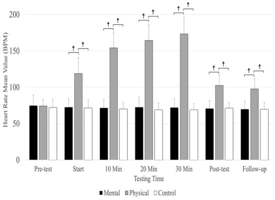 The means and standard deviations of heart rate for the three conditions (physical fatigue, mental fatigue, and control) at the seven testing times. ☨ indicates p < 0.001 compared to the control and mental fatigue conditions.