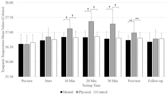 The means and standard deviations of tympanic temperature under the three conditions (physical fatigue, mental fatigue, and control) at the seven testing times. ☨ indicates p < 0.001 compared to the control and mental fatigue conditions. ** indicates p < 0.01 compared to the control and mental fatigue conditions.
