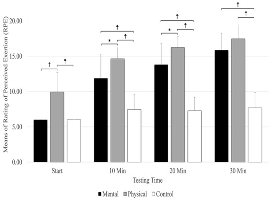 The means and standard deviations of Rating of Perceived Exertion (RPE). ☨ indicates p < 0.001 compared to the control and mental fatigue conditions. * Indicates p < 0.05 compared to mental fatigue condition.