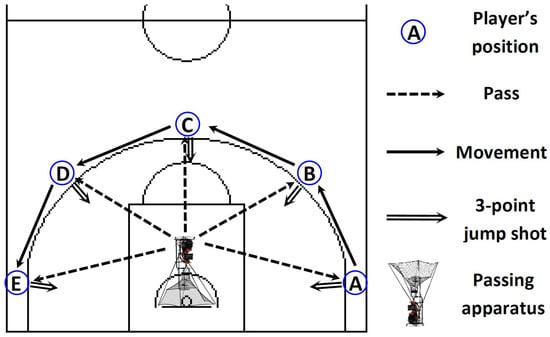 The 3-point shooting test. The participants performed a sequence of three consecutive 3-point jump shots from the A to E positions (i.e., left corner, left wing, top, right wing, and right corner), 15 shots in total.