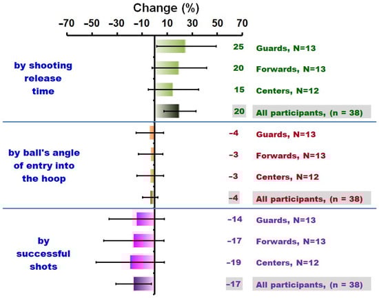 Changes in 3-point jump shot release time, ball’s entry angle into the hoop, and successful shots values (from the PRE to the POST conditions) across groups and in all participants. Error bars present the lower and upper bounds of the 95% confidence intervals. Abbreviations: BEST, basketball exercise simulation test; n, sample size of the study; N, sample size of the groups; POST, condition after the BEST; PRE, condition prior to the BEST.
