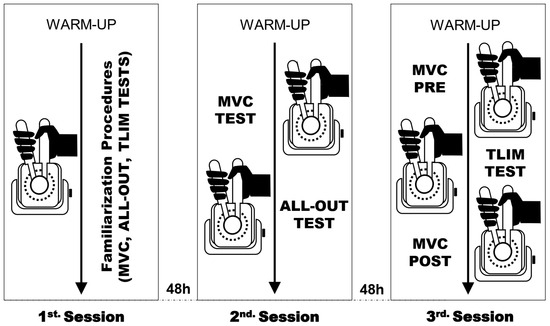 All experimental sessions were conducted in a climate-controlled laboratory (21–23 °C) at the same time each day. Participants from both groups attended the laboratory on three different occasions, separated by at least 48 h. The first visit was designed to familiarize the participants with the experimental procedures, the acquisition of anthropometrical data (i.e., height, weight, and skin folds), the acquisition of ultrasonographic images of the forearm muscles, and the determination of electrostimulation current intensity. During the second visit, all participants performed a handgrip all-out test for the determination of CT and W′. In the third visit, the participants performed a handgrip test in the severe-intensity domain until task failure for the evaluation of neuromuscular fatigue and tolerance. Figure 1 shows an overview of the study design.