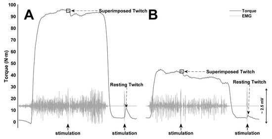 %Voluntary activation = [1 − (force before superimposed twitch/MVC) ∙ (superimposed twitch/resting twitch)] ∙ 100