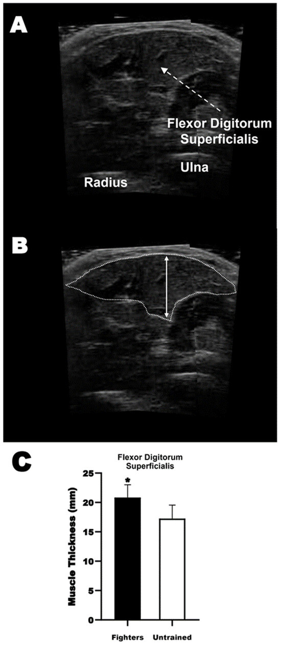 Figure 3. Muscle thickness. (A) shows the ultrasound assessment of flexor digitorum superficialis (humeroulnar head); (B) shows the methodological approach to determine muscle thickness; and (C) shows the results as mean ± SD of muscle thickness for both groups. This Symbol (*) means that GCS fighters had a significant grater flexor digitorum muscle thickness compares to the untrained individuals. * p < 0.05 compared to the untrained individuals.