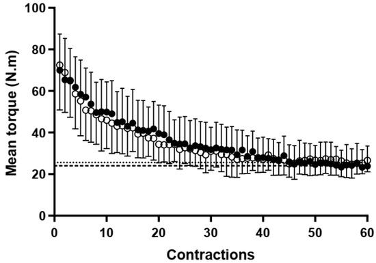 Figure 4. 5 min handgrip all-out test. Mean torque ± SD during 5 min all-out test from GCS fighters (●) and untrained participants (). The dashed and dotted lines correspond to the CT of fighters and untrained, respectively.