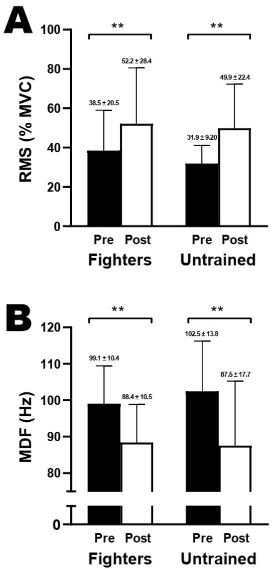 Two-way repeated measures ANOVA showed a significant time effect for RMS (F = 18.5; p < 0.05; ηp2 = 0.47, large) and MDF (F = 43.3; p < 0.05; ηp2 = 0.67, large) for both groups. However, no significant differences between groups and interaction effects were found (p > 0.05). Relative pre-to-post comparisons showed no significant differences for RMS (fighters 42.9 ± 29.6% vs. untrained 60.8 ± 68.6%, p > 0.05) and MDF (fighters −10.4 ± 10.2% vs. untrained −15.0 ± 8.88%, p > 0.05) between groups. Also, relative pre-to-post comparisons based on neuromuscular efficiency analysis showed no significant differences between groups (fighters −30.2 ± 14.9% vs. untrained 32.6 ± 26.0%, p > 0.05). Figure 5 shows an overview of the effect of severe-intensity contractions on the first and last 30 s of electromyography signals.