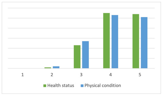 The health status perceived by the participants was very positive, with an average value of 4.21 points (SD = 0.75) on a 5-point Likert scale, where 1 is very bad and 5 is very good. In the same way and on a 5-point scale, participants rated their average physical condition with a mean score of 4.15 points (SD = 0.79). None of the respondents scored their health or fitness status as 1. Both variables have similar response frequency distributions for each of the scores (Figure 1).