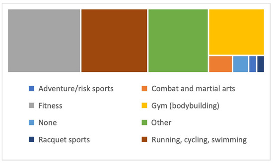 In terms of physical activity and sports frequency, 31.6% practised for 3–4 h per week, 28.6% for 5–6 h, 27.8% for 7 or more, and only 12% practised for 2 or fewer hours per week. The intensity exercise for those who practised tended to be moderate (48.8%), followed by those who preferred vigorous exercise (30.8%), while 13.5% exercised at low intensity, and 3% did not exercise at all. The most practised modalities were fitness activities (25.5%), individual cyclic sports—running, cycling, and swimming (23.3%)—and gym and bodybuilding (14.3%) (Figure 2).
