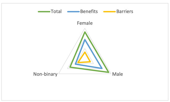 By gender, males scored higher than females in total punctuation (135.63 vs. 131.58 points) and the benefits scale (97.51 vs. 93.51 points). The only person self-identified as non-binary scored significantly lower on total and benefits while scoring 8 points above the overall average for the whole sample (Figure 4).
