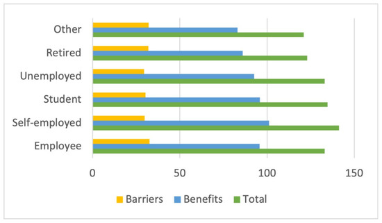 Concerning employment status, self-employed participants scored considerably higher overall (141.25 points), as well as on the scale of perception of benefits of the activity performed (101.12 points). Those working as employees (32.63 points), on the other hand, perceived the greatest barriers to the activity (Figure 5).