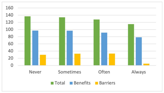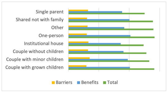 In terms of cohabitation status, couples with grown children and people living alone scored highest overall (above 141 points), followed closely by those living with non-family members (139 points); the same is true for perceived benefits, with values of 101.1, 101.86, and 100.57 points, respectively. In contrast, people living in institutional households (86 points) and single parents (88.37 points) found the least benefits. Regarding barriers, however, it was couples with young children (34.94 points), followed by single parents (32.37 points) and childless couples (32.26 points), who found the greatest difficulties (Figure 6).