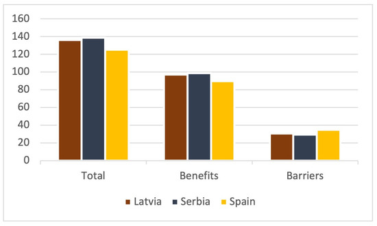 Per country, Serbians scored the highest in total (138.64 points) and perceived benefits (98.81 points), while Spanish participants did so in barriers (34.82 points) (Figure 7).