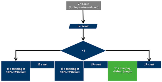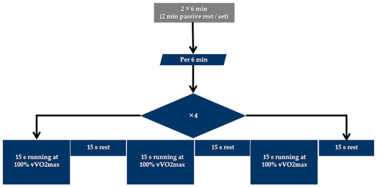The running session (RUN) included two 6 min sets of high-intensity running exercise, as illustrated in Figure 1. The participants had to complete 12 repetitions of running for 15 s at 100% of vVO2max interspersed with 15 s intervals of passive recovery [26,27]. The recovery interval between sets was 2 min.