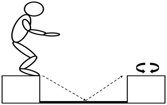 The integrated (INT) session included a combination of high-intensity running and jumping exercises of 2 × 6 min, as illustrated in Figure 2. During each 6 min set, the participants had to complete 4 consecutive rounds of 1.5 min, each including 2 bouts of 15 s running at 100% vVO2max and one 15 s bout of jumping (9 drop jumps) from the predetermined height, all interspersed with 15 s of passive recovery. The drop jumping exercise was executed using two boxes of appropriate height, as shown in Figure 3. The distance between the two boxes was 1 m and a metronome was used to determine drop jump rate.