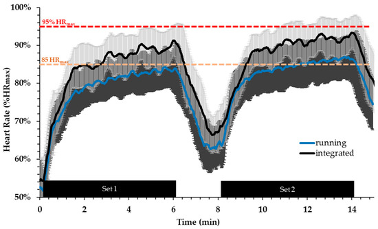 Heart rate during the integrated aerobic and power session and running-only session. Orange line indicates 85% of HRmax and red line indicates 95% of HRmax.