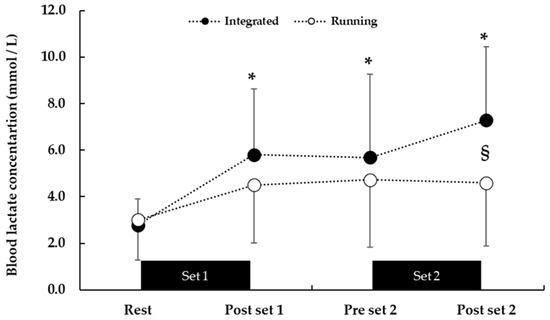 Blood lactate concentration during the integrated aerobic and power session (black) and the running only session (white). Time corresponds to that after the start of the first set (see Figure 5). * p < 0.001 from rest, § p < 0.05 between conditions.