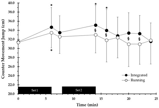 Countermovement jump performance during the integrated aerobic/power session and the running session. * p < 0.001 from baseline, § p < 0.05 between conditions.