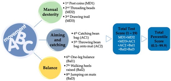 - Schoemaker, M.M.; Niemeijer, A.S.; Flapper, B.C.T.; Smits-Engelsman, B.C.M. Validity and reliability of the Movement Assessment Battery for Children-2 Checklist for children with and without motor impairments. Dev. Med. Child Neurol. 2012, 54, 368–375. [Google Scholar] [CrossRef]