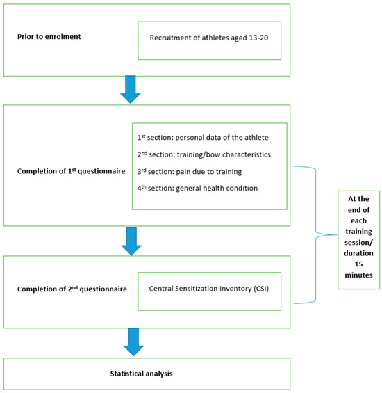 The study received approval from the ethics committee of the Physiotherapy Department at the University of Thessaly (Protocol Number: 118/02-10-2018). Prior to commencing the proceedings, athletes were informed through the Candidate Volunteer Information Form from the World Archery Federation that had approved the current study. The form contained detailed information about the study’s content and objectives. Athletes and their guardians (national teams’ representatives) willingly agreed to participate in the research after being fully informed, given their written consent. Following their consent, volunteers proceeded to the designated area set up inside the stadium to complete the questionnaires. The questionnaires were filled out on a daily basis, at the end of their training sessions and before games, with an approximate duration of 15 min. To ensure clarity and prevent misinterpretation of the questions, a team consisting of a physiatrist, two physiotherapists, and two undergraduate physiotherapy students was present to provide oral explanations as needed (Figure 1).
