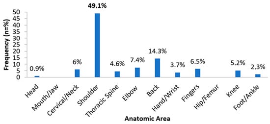 Less commonly reported were injuries to the elbow, finger, and knee, which were nonetheless identified as areas of pain interest for these athletes. Hand/wrist and foot/ankle areas were the least reported in terms of pain, as visually represented in Figure 2.