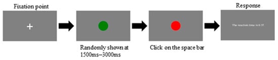 - Simple Reaction Time Test (SRT test): Participants were instructed to press the ‘space’ bar immediately when the screen cue changed from green to red. At first, a fixation point (‘+’) was displayed in the center of the monitor for 500 ms. The green cue was shown after the appearance of the fixation point, and it lasted for a random period between 1500 and 3000 ms, whereas the red cue persisted for 3000 ms. Following the response to the red cue, the response time of the previous trial was shown on the screen for 1000 ms (Figure 1).