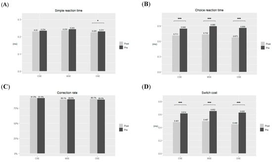 The results of the pre-test and post-test for closed-skill exercise, mixed-skill exercise, and open-skill exercise groups. (A) Mean simple reaction time, (B) mean choice reaction time, (C) mean correction rate in percentage, and (D) mean switch cost. * p < 0.05, *** p < 0.001.