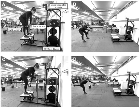 The flywheel deadlift exercise was performed in four different situations: (1) vertically loaded in a bilateral situation (Bi + Ver), (2) vertically loaded in a unilateral situation (Uni + Ver), (3) horizontally loaded in a bilateral situation (Bi + Hor), and (4) horizontally loaded in a unilateral situation (Uni + Hor). All these exercise variants were performed randomly in a flywheel device (Epte Inertial Concept, Ionclionis and Deionic, LAlcúdia, Valencia, Spain). In the case of the vertically loaded variants, participants performed the deadlift exercise by standing upright on the flywheel device platform (Figure 1A,B) while holding the device’s barbell (Bi + Ver) or hand grip with the contralateral hand (Uni + Ver). When performing the Bi + Ver variant, participants were instructed to slightly blend the knees and point the toes straight ahead, with a straight back and a retracted scapula with pelvic anteversion that must be maintained during exercise. Participants were required to perform a gently eccentric contraction by flexing the hip allowing the torso and barbell to lower to the anterior tuberosity of the tibia height, where the upper body was almost horizontal (90° hip flexion; Figure 1A) and where a maximal eccentric contraction occurred to break the movement, just before extending their hip and returning to an upright position (0° hip flexion) after a maximal concentric contraction. Participants were instructed to keep the barbell close to the body. When the Uni + Ver variant was used, participants were instructed to slightly blend the knee of the dominant leg, point the toes straight ahead, and transfer their weight onto this leg to perform the exercise, maintaining the same position described above. The participant’s contralateral limb was kept extended and at no time contacted the floor during the exercise. All participants were instructed to avoid hip abduction and adduction of the non-exercised leg, keeping the toes of the non-exercised leg pointing downwards. Participants were instructed to perform the exercise holding the grip with the contralateral hand, while they were allowed to place the ipsilateral hand on a fixed point just to provide stability to the movement (Figure 1B). Similarly, in the case of the horizontally loaded variants, participants performed the deadlift exercise by standing on the floor in front of the flywheel device (Figure 1C,D) at approximately 2 m (so that the maximum length of the flywheel cable coincides with the end of the range of motion of the concentric phase) while holding the device’s barbell (Bi + Hor) or hand grip (Uni + Hor). In this sense, the movement began in a fully upright position, with the hands at chest height, placing the barbell or the grip 5 cm from the participant’s chest. Participants were then instructed to perform a gently eccentric contraction until they reached 90° hip flexion, at which point they were requested to perform a maximal eccentric contraction to break the movement and to claim the fully upright position (0° hip flexion) through a maximal concentric contraction. The height of the cable and the distance to the flywheel device were individually regulated for each participant. The technical characteristics described for both vertically loaded variants were also maintained. In the case of Uni + Hor, participants were allowed to place the ipsilateral hand on a fixed point to provide stability to the movement.
