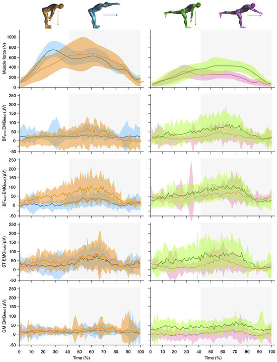 Force production (N) at hand-grip level (first row), biceps femoris muscle activity at proximal (second row) and medial level (third row), semitendinosus muscle activity (fourth row) and gluteus medius muscle activity (fifth row) during the bilateral vertically loaded (blue), bilateral horizontally loaded (orange), unilateral vertically loaded (green), and unilateral horizontally loaded (pink) flywheel deadlift exercise. Each panel displays the group mean (solid line) ± mean upper and lower limits (shaded band) during the total duration of a single repetition. The light grey area reflects the mean eccentric contraction phase for the bilateral (~41%) and unilateral (~43%) flywheel deadlift exercise variants.