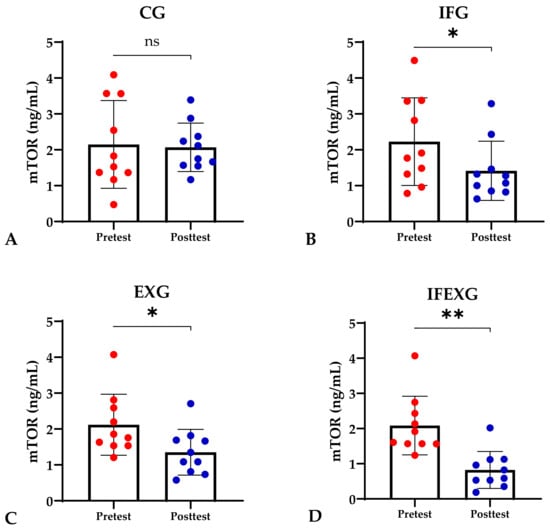 | ∆-mTOR (ng/mL) | −0.08 ± 1.33 | −0.81 ± 0.97 | −0.76 ± 0.59 | −1.26 ± 0.79 * | 0.047 † |