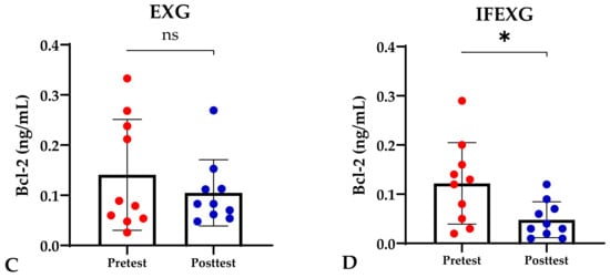 - Jafari, A.; Pourrazi, H.; Nikookheslat, S.; Baradaran, B. Effect of Exercise Training on Bcl-2 and Bax Gene Expression in the Rat Heart. Gene Cell Tissue 2015, 2, e60174. [Google Scholar] [CrossRef]