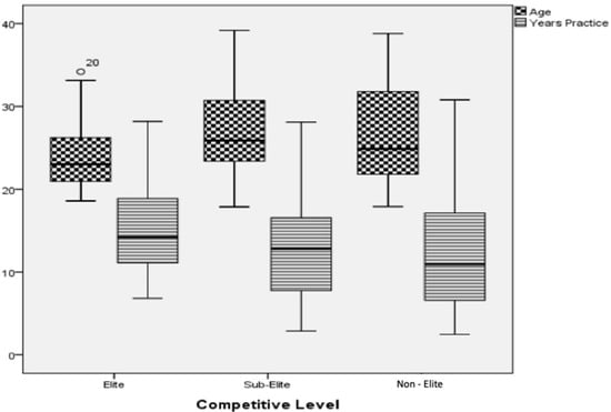 | Elite | 27 | 18.77 ± 1.18 | 1.35 (0.75± 1.94) | <0.001 | |
