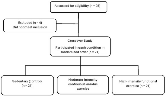 A post hoc calculation was conducted using prior work as a guide G*Power [61] to determine whether the sample size was sufficient. Based on previous results assessing changes in affective states following acute exercise [62], the following parameters were defined: Cohen’s f: 0.47; alpha error probability: 0.05; 1-beta: 0.95; with three conditions and four time points; and an estimated correlation among repeated measures of 0.5, therefore, the sample size needed to detect a significant effect was determined to be 15. As such, the 21 participants that met our inclusion criteria were deemed satisfactory.