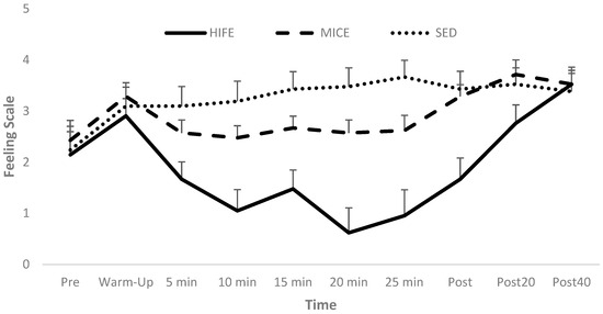Therefore, the present study aimed to explore three main purposes. The first purpose was to assess the post-exercise enjoyment following high-intensity functional exercise (HIFE), moderate-intensity continuous exercise (MICE), and a sedentary, no-exercise period (SED). The second purpose was to examine the changes in affective states from before, immediately after, and 20 and 40 min after each condition. The third was to examine the in-task valence during each condition. Based on previous research that assessed enjoyment and affective responses to high-intensity interval and moderate-intensity aerobic exercise [51,52,53], it was hypothesized that post-exercise enjoyment would be similar following HIFE and MICE, but that both conditions would result in greater enjoyment relative to SED. Second, it was hypothesized that participants would report significant increases in positive affect and decreases in negative affect after the completion of HIFE and MICE relative to SED. Finally, it was hypothesized that in-task valance would be significantly more positive during MICE relative to HIFE.