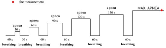 Measurements before and after the intervention and the intervention itself were the same. The test occurred in the laboratory lying on a couch at a room temperature of 20.5–21.5 °C. The participants were not wearing any masks or any respiratory protection. During the measurement, we used apnea diving training based on O2 training [], which was modified by the divers who participated in the study over many years of training. All subject groups began with 30 s of apnea followed by 60 s of hyperventilation. Hyperventilation intervals were according to the ambient air (FiO2 = 20.93%). The participants’ hyperventilation time between apneas was always the same at 60 s. Apnea duration between hyperventilations was consistently increased by 30 s, and the sixth terminal apnea was maximal for all participants; the measurement scheme is described in Figure 1.